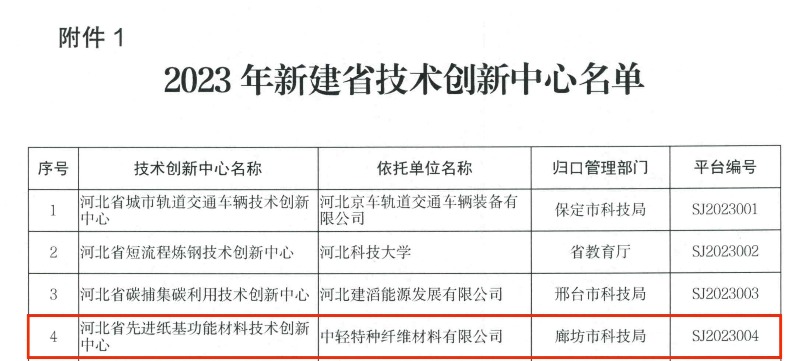 近日,河北省科學技術(shù)廳發(fā)布《關(guān)于公布2023年新建省技術(shù)創(chuàng)新中心名單的通知》(冀科平函〔2023〕36號),中國造紙院所屬中輕特種纖維材料有限公司(以下簡稱“中輕特材”)獲批“河北省先進紙基功能材料技術(shù)創(chuàng)新中心”,成為“央地合作”打造技術(shù)創(chuàng)新平臺新樣板。